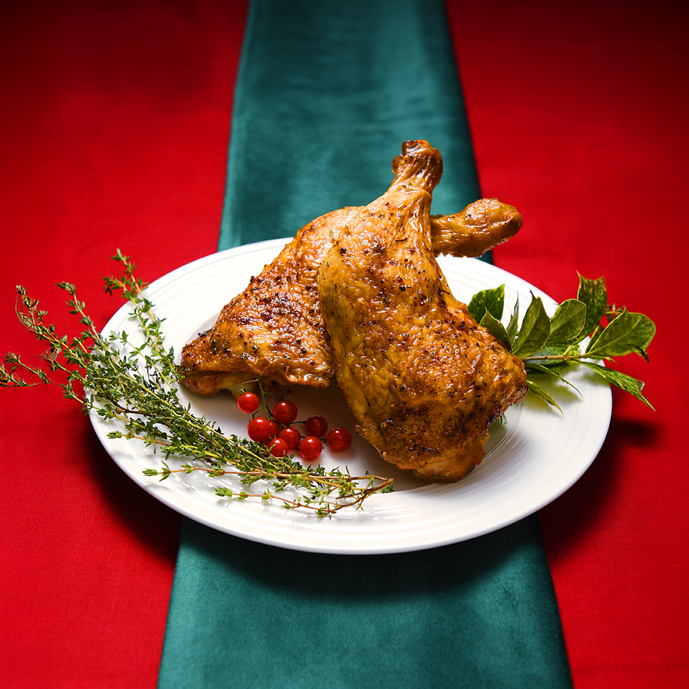 香辛料で一昼夜しっかりと味をしみ込ませ、オーブンでじっくりとローストしました。皮はこんがりと、中はしっとりとやわらか。ジューシーな旨みと豊かな香りが、口いっぱいに広がります。